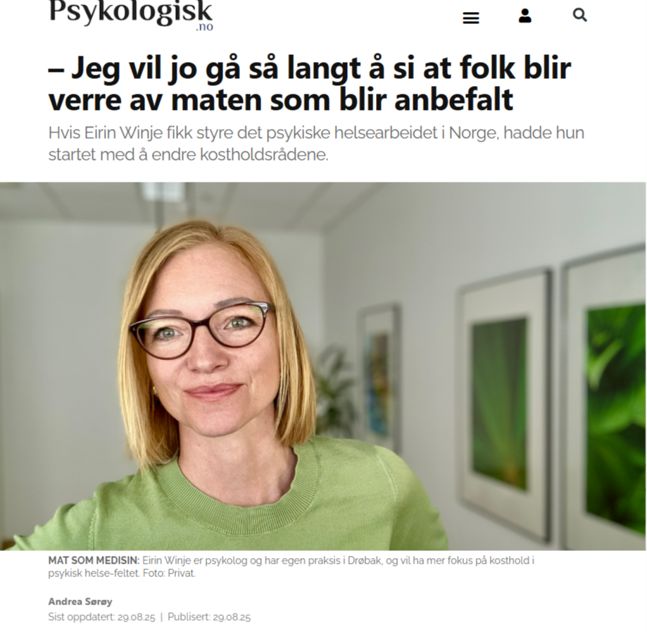 Redaksjonelt intervju i Psykologisk.no der Dr. Eirin Winje, psykologspesialist og forsker, uttaler seg om sammenhengen mellom kosthold, metabolsk helse og psykiske lidelser, samt om faglige og helsepolitiske perspektiver på psykisk helsevern.