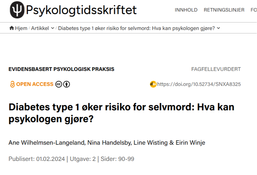 Fagfellevurdert artikkel av Winje, Wilhelmsen-Langeland, Handelsby og Wisting som analyserer sammenhenger mellom type 1-diabetes og selvmordsrisiko, med fokus på psykologens rolle i behandling og forebygging.
