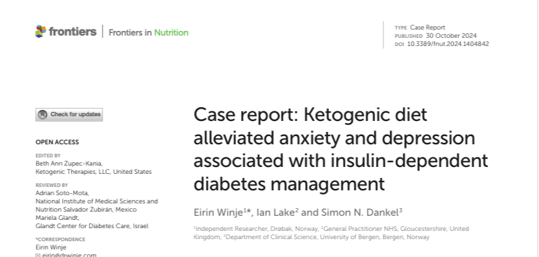 Fagfellevurdert case-rapport der Dr. Eirin Winje og medforfattere beskriver hvordan en ketogen diett ble assosiert med bedring i angst og depresjon hos en pasient med insulinavhengig diabetes, og drøfter potensielle mekanismer og implikasjoner.